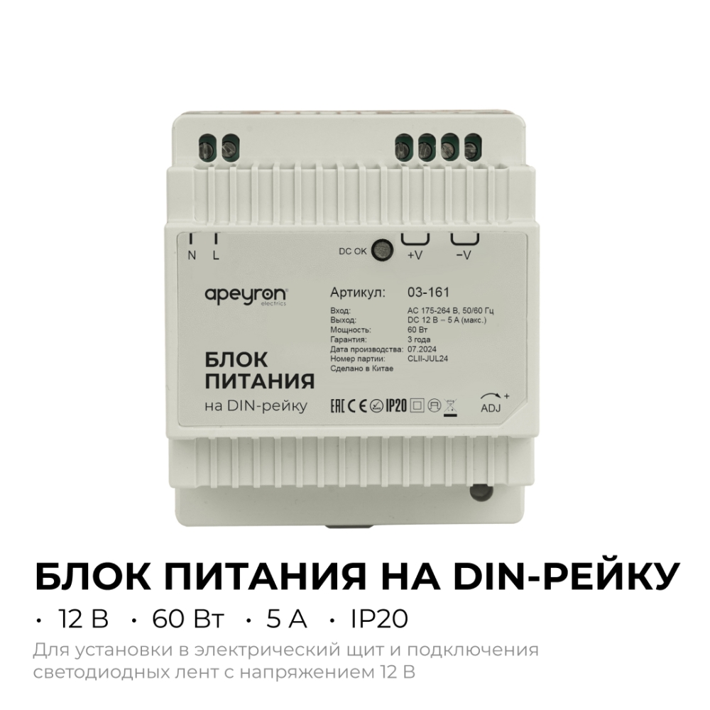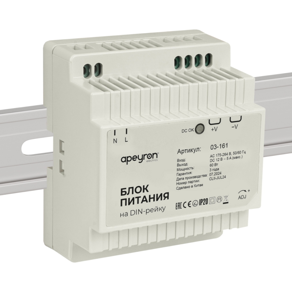 Блок питания на DIN рейку APEYRON 12В, 60Вт, 175-264В, 5А, IP20, 78х93х56мм, пластик, белый