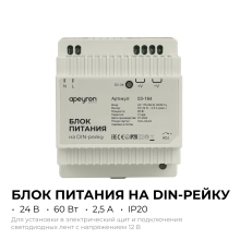 Блок питания на DIN рейку APEYRON 24В, 60Вт, 175-264В, 2,5А, IP20, 78х93х56мм, пластик, белый