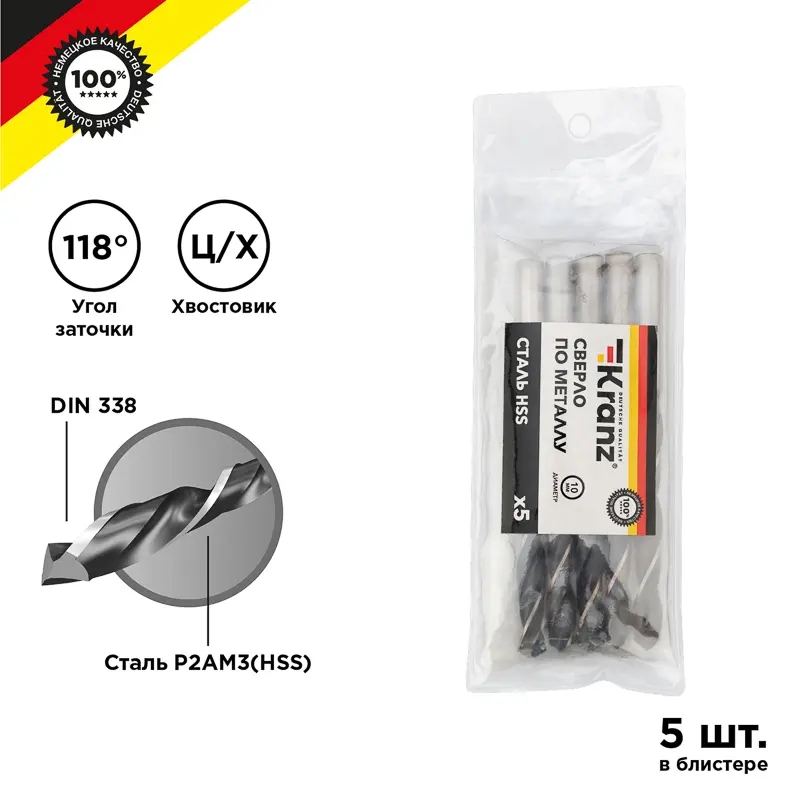 Сверло по металлу 10,0х133х87 мм HSS (5 шт. в упаковке) DIN 338 Kranz