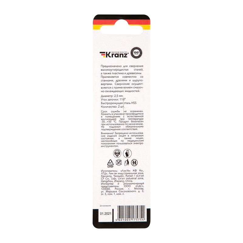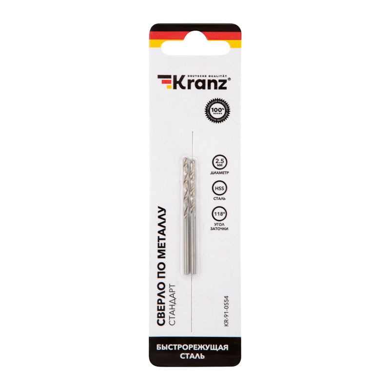 Сверло по металлу 2,5х57х30 мм «Кобальт» (сталь HS 2,5х57х30 мм HSS (2 шт. в упаковке) DIN 338 Kranz