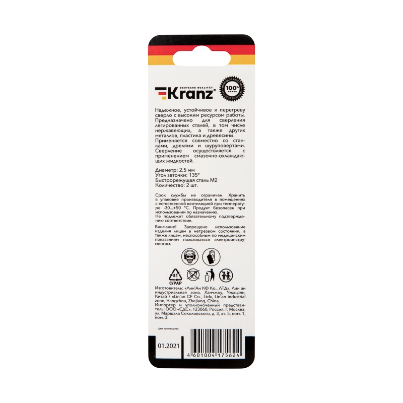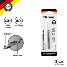 Сверло по металлу 2,5х57х30 мм «Стандарт+» (P6M5 M-2) (2 шт. в блистере) DIN 338 Kranz