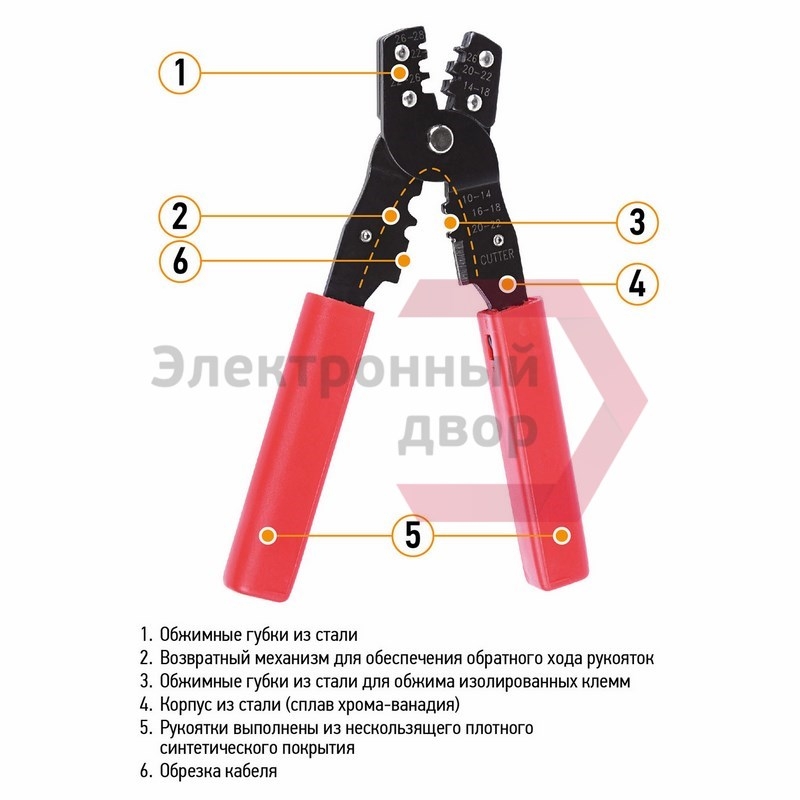 Кримпер для обжима ht-202B. Применение:  - Обжим изолированных и неизолированных наконечников, клемм Размер обжимных наконечников: - Диапазон: 0.10-6.0 мм² Материалы: Материал изделия (корпуса): закаленная сталь Покрытие изделия (корпуса): воронение Рукоятки: ПВХ  Особенности: - Режущая кромка для равномерной обрезки проводников - Возвратный механизм для обеспечения...
