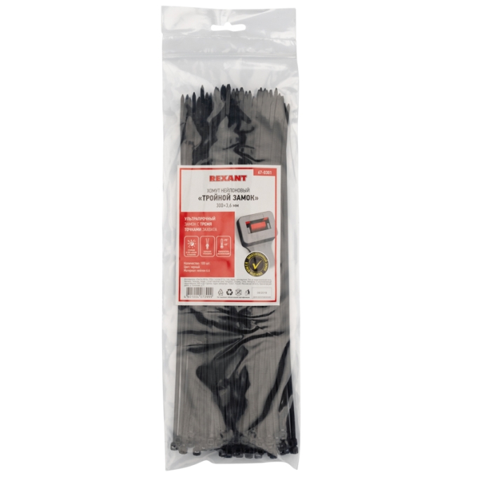 Хомут-стяжка нейлоновая REXANT с тройным замком 300x3,6мм, черная (100 шт/уп)