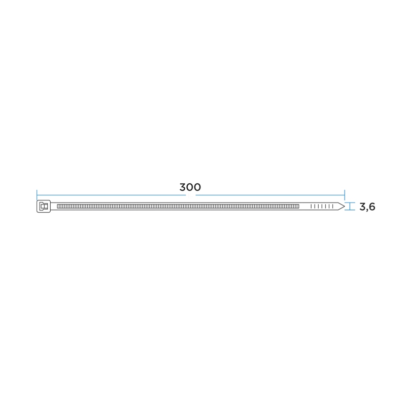 Представляет собой черную нейлоновую полоску с высоким уровнем гибкости размером 300x3,6 мм. Стяжка изготовлена из нейлона-6,6, износостойкого и прочного материала.