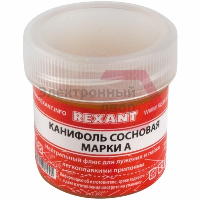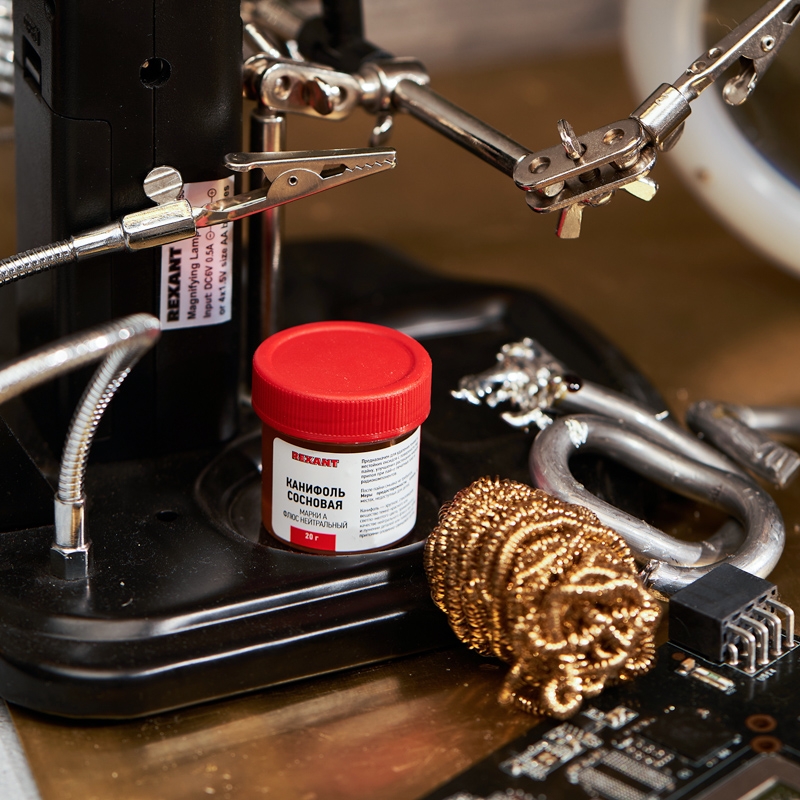 Канифоль сосновая марки А 20 г REXANT предназначена для удаления тонких и нестойких оксидов с поверхности под пайку, улучшения растекания жидкого припоя при пайке печатных плат и радиокомпонентов.