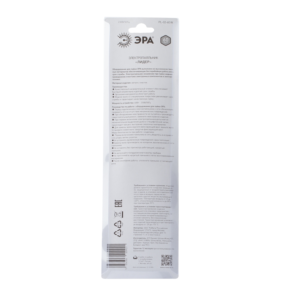 Паяльник ЭРА 60Вт 230В 'Лидер' 2-комп.рукоят,жало Long life PL-02-60 W (50/750)