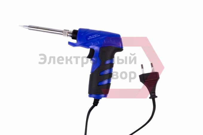 Паяльник выполнен с керамическим нагревательным элементом и индикатором включения в форме пистолета и имеет очень удобную эргономичную рукоятку из ударопрочного пластика с резиновыми вставками.