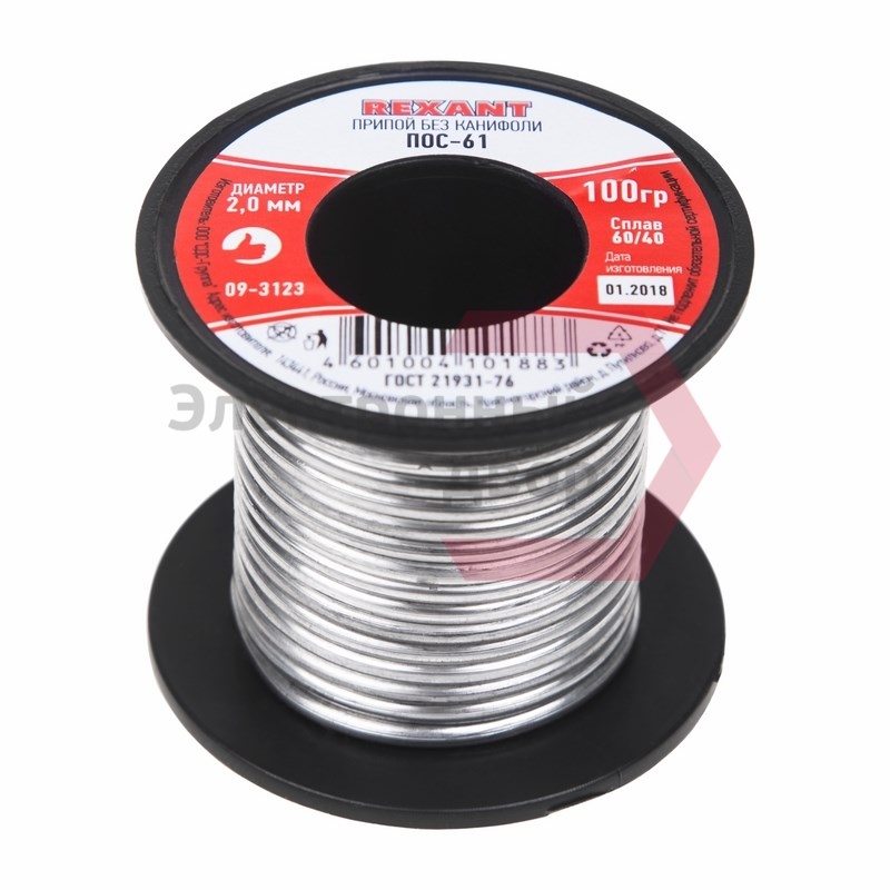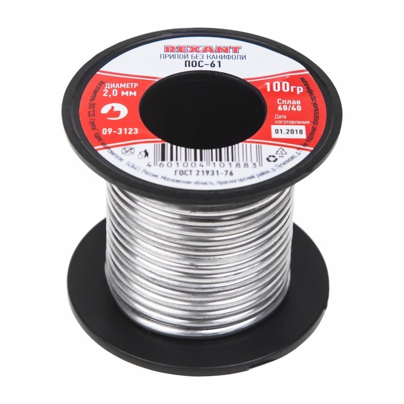 Припой без канифоли ПОС-61 REXANT, 100 г, Ø2,0 мм, (олово 61%, свинец 39%), катушка 1/200