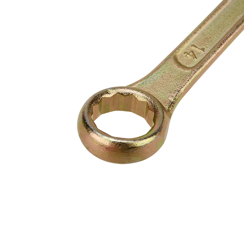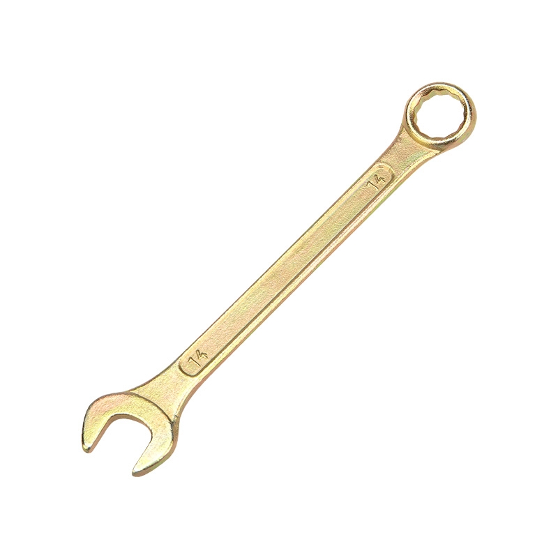 Комбинированный гаечный ключ предназначен для монтажа и демонтажа резьбовых соединений: болтов и гаек. Инструмент применяется в бытовых условиях, в слесарных мастерских и на производстве. Желтое оцинкованное покрытие препятствует появлению коррозии и продлевает срок службы инструмента. Технические характеристики: Твердость материала рабочей части ключа: 44-48 HRC Размер: 14 мм