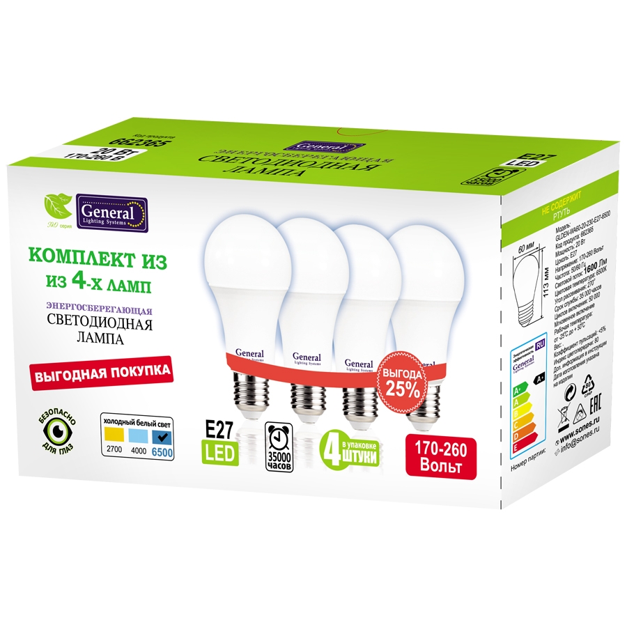 Лампа General LED-WA60 20Вт E27 6500К угол 270 1620лм (упак.4шт)