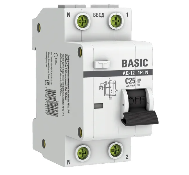 Диф.автомат Basic 1P+N 25А 30мА тип АС х-ка C эл. 4,5кА АД-12 EKF
