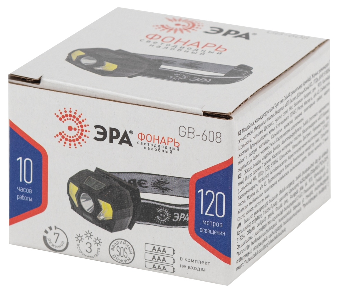 ЭРА GB-608 – функциональный налобный LED-фонарь на батарейках (3 х ААА). В зависимости от ситуации применения позволяет выбирать любой из 7 (!) режимов свечения. Легко регулировать яркость, включать дальний направленный свет (сверхмощный светодиод нового поколения) или широкое заполняющее освещение (СОВ-матрица «мультикристалл на плате»), а также режимы аварийного мигания, SOS.