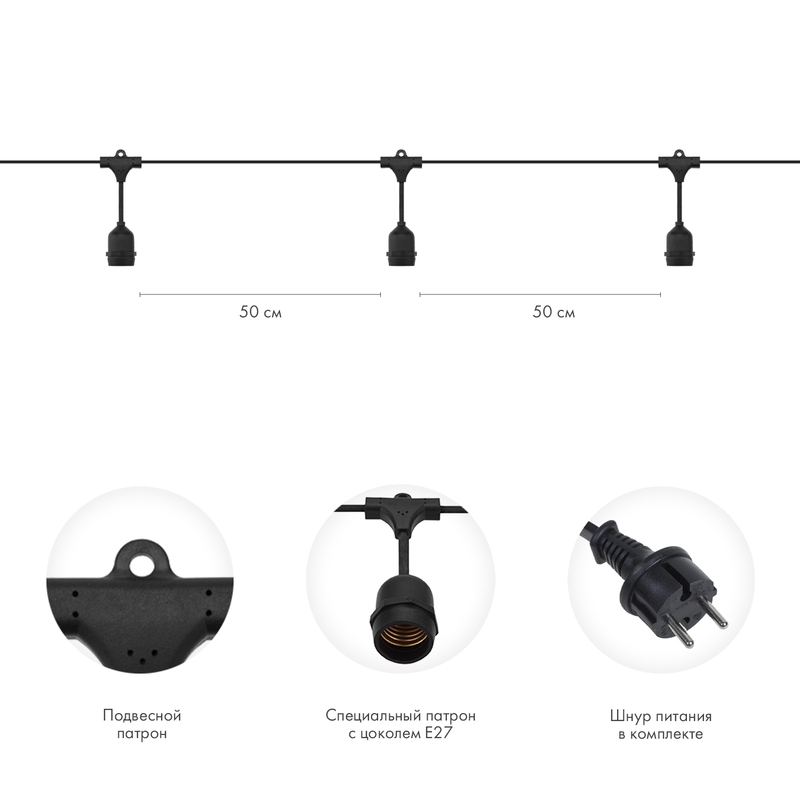 Белт-Лайт 10м 2 жилы черный каучук, шаг 50см, 20 подвесных патронов Е27, шнур 3м, IP44, соединяется