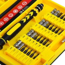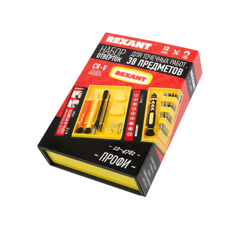 Набор для точных работ REXANT Профи 38 в 1 оптимально подходит для выполнения прецизионных работ в электронике и электромеханике, ремонта телефонов, планшетов, ноутбуков, электронных книг, часов, в т. ч. MacBook и iPhone. Биты выполнены из качественной хромованадиевой стали, обладающей высокой прочностью к механическим повреждениям и образованию ржавчины. Прорезиненные пластиковые рукоятки эргономичной формы с вращающимися шляпками не скользят в ладони, что обеспечивает дополнительный комфорт при работе. Вращающиеся шляпки позволяют упереть основания отверток в ладонь и производить прокручивание инструментов только пальцами без постоянного перемещения руки.Цанговый зажим отвертки обеспечивает быструю замену и надежную фиксацию насадок. Пинцет с изогнутыми острыми губками помогает работать с мелкими деталями. Набор инструментов и бит поставляется в пластиковом прорезиненном футляре.Характеристики:Головки: PH2, М2.5, М3, М3.5, М4, М4.5, М5, М5.5Биты: PH1, PH1.5, PHPH2, PH3.5H0.9, H1.5, H2.0, H3.0Т3, Т4, Т5, Т6, Т7SL1.0, SL2.0U2.6Υ2.0Pentalobe 0.8▲ (Triangle) 2.0ʘ (аналог скрепки для слота SIM-карты) 0.82 отвертки специального назначения для: iPhone, Android2 пластиковых медиатора для вскрытия корпусов/экранов: даБулавка для открытия слотов SIM-карт и карт памяти: даПрисоска для снятия экрана: даГибкий удлинитель: даЖесткий удлинитель: даОтвертка: даПинцет: даПосадка бит: 1/8Материал насадок: хромованадиевая стальМатериал пинцета: нержавеющая сталь AISI 304Материал футляра: ABS-пластик, резина