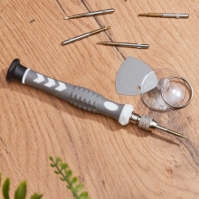 Набор отверток REXANT 8 в 1 оптимален для выполнения прецизионных работ в электронике и электромеханике, ремонта большинства видов и моделей популярной портативной техники: смартфонов, часов, планшетных ПК, игровых приставок, фотокамер, электронных сигарет. Комплект пригодится для ремонта техники Apple. Инструменты выполнены из качественной стали, обладающей высокой прочностью к механическим повреждениям и образованию ржавчины. Отвертка эргономичной формы обладает вращающейся шляпкой и противоскользящей рукояткой. В наборе предусмотрены медиатор для снятия корпуса, извлечения деталей, схем и присоска для удаления экрана. Цанговый зажим обеспечивает быструю замену и надежную фиксацию насадок.Характеристики:Pentalobe (шлиц для продукции Apple): 0.8TORX (шестигранная звезда): T2, T5PHILLIPS (крестовая): PH1.2, PH1.5Отвертка: даМедиатор: даПрисоска: даПосадка бит: 1/8Материал насадок: хромованадиевая стальМатериал рукоятки: ABS-пластик