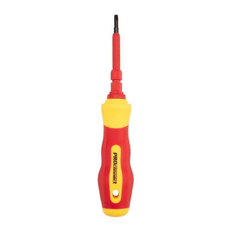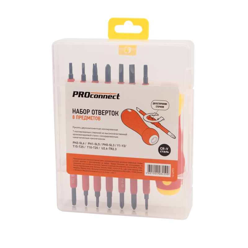 Набор отверток PROconnect 8 в 1 предназначен для электромонтажных работ, монтажа/демонтажа крепежных соединений: шурупов, саморезов и т. д. Двухсторонние диэлектрические стержни отвертки, изготовленные из высококачественной хромованадиевой стали, покрыты специальным изоляционным материалом и обладают оксидированными намагниченными наконечниками. Корпус эргономичной изолированной рукоятки выполнен из пластика, не скользит в ладони, что обеспечивает дополнительный комфорт при работе. Набор поставляется в пластиковом боксе для удобства хранения и транспортировки.Характеристики:Типы шлицев: PH2-SL6, PH1-SL5, PH0-SL3, Y1-Y2, Т15-Т25, Т10-Т20, U2.6-TR2.3Размеры двусторонних стержней: 160 ммКоличество стержней: 7 шт.Рукоять отвертки: даМатериал стержней: CrV сталь, ABS-пластикМатериал отвертки: ABS-пластикМатериал бокса: ABS-пластик