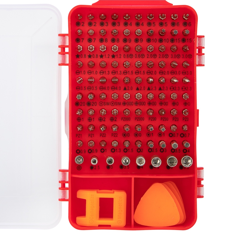 Набор отверток для точных работ KRANZ отлично подходит для ремонта телефонов, компьютеров, приемников и для многих популярных приборов, которые используются в быту. Выполнен из высококачественной хромованадиевой стали CR-V с высокой устойчивостью к коррозии и образованию ржавчины. Точно подобранные по характеристикам магнитные насадки отлично подходят для профессионального ремонта и для мелких бытовых работ.В наборе 114 предметов:Биты: PH000х2, PH00х2, PH0х2, PH1х2, PH2х2Special PH2SL1х2, SL1.3х2, SL1.5х2, SL2х2, SL3х2, SL3.5х2, SL4x2 T2х2, T3х2, T4х2, T5х2, T6x2, T7x2, T8x2, T9x2, T10x2, T15x2, T20x2H0.7x2, H0.9x2, H1, H1.3, H1.5, H2, H2.5, H3, H3.5, H4P2х2, P5х2, / Pentalobe 0.8х2, 1.2х2, Triangle 2x2, 2.3x2SQ0,1x2U2.3х2° 0.8x2Y0.6х2, Y2х2, Y3x2 PZ000x2, PZ00x2, PZ0x2, PZ1x2, PZ2x2M2.5, M3, M3.5, M4, M4.5, M5, M5.5Рукоятка, удлинитель, гибкий удлинитель, пинцет, переходник, магнит, присоска, иглаСпуджеры и медиаторы: 10 шт.Посадка бит: 1/8