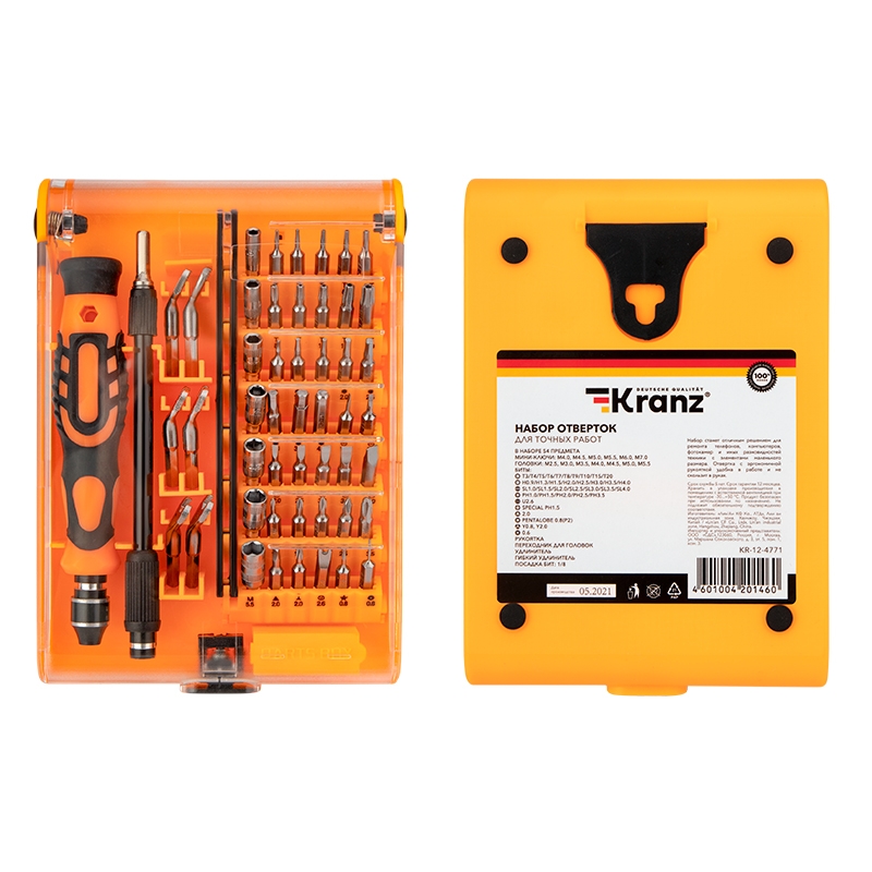 Набор отверток для точных работ KRANZ отлично подходит для ремонта телефонов, компьютеров, приемников и для многих популярных приборов, которые используются в быту. Выполнен из высококачественной хромованадиевой стали CR-V с высокой устойчивостью к коррозии и образованию ржавчины. Точно подобранные по характеристикам магнитные насадки отлично подходят для профессионального ремонта и для мелких бытовых работ.В наборе 54 предмета:Мини-ключи: M4.0 M4.5 M5.0 M5.5 M6.0 M7.0Головки: M2.5 M3.0 M3.5 M4.0 M4.5 M5.0 M5.5Биты: T3/T4/T5/T6/T7/T8/T9/T10/T15/T20H0.9/H1.3/H1.5/H2.0/H2.5/H3.0/H3.5/H4.0SL1.0/SL1.5/SL2.0/SL2.5/SL3.0/SL3.5/SL4.0PH1.0/PH1.5/PH2.0/PH2.5/PH3.5U2.6Special PH1.5 TRI-WING 2.0 Pentalobe 0.8Y0.8, Y2.0 °0.6РукояткаПереходник для головок УдлинительГибкий удлинительПосадка бит: 1/8