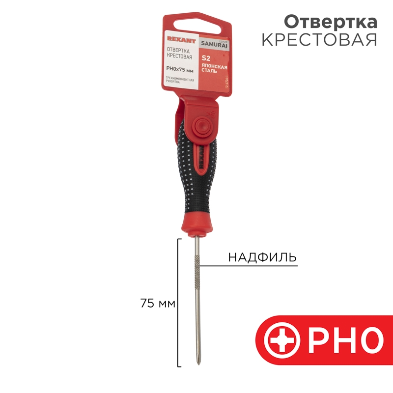 Отвертка крестовая PH0х75мм, трехкомпонентная рукоятка, сталь S2 REXANT
