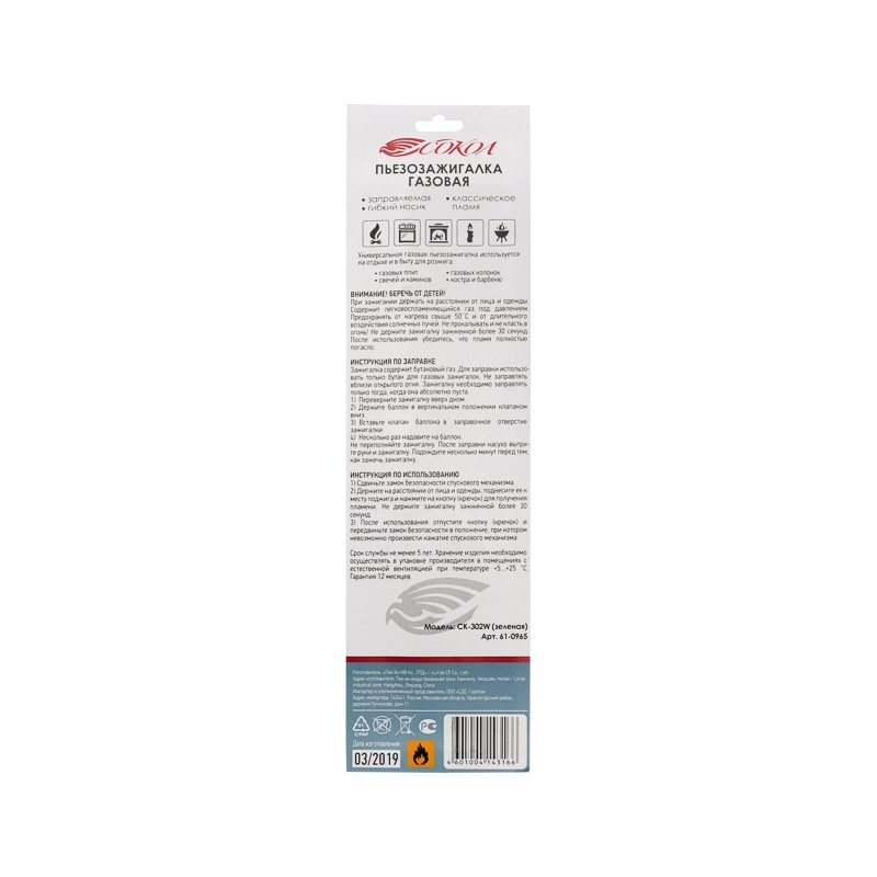 Зажигалка газовая бытовая, с пьезоэлементом и гибким стержнем. Общие габариты зажигалки: 258х33х21 мм Основные характеристики: Регулировка пламени Возможность наполнения Детский предохранитель Цвет: зеленый