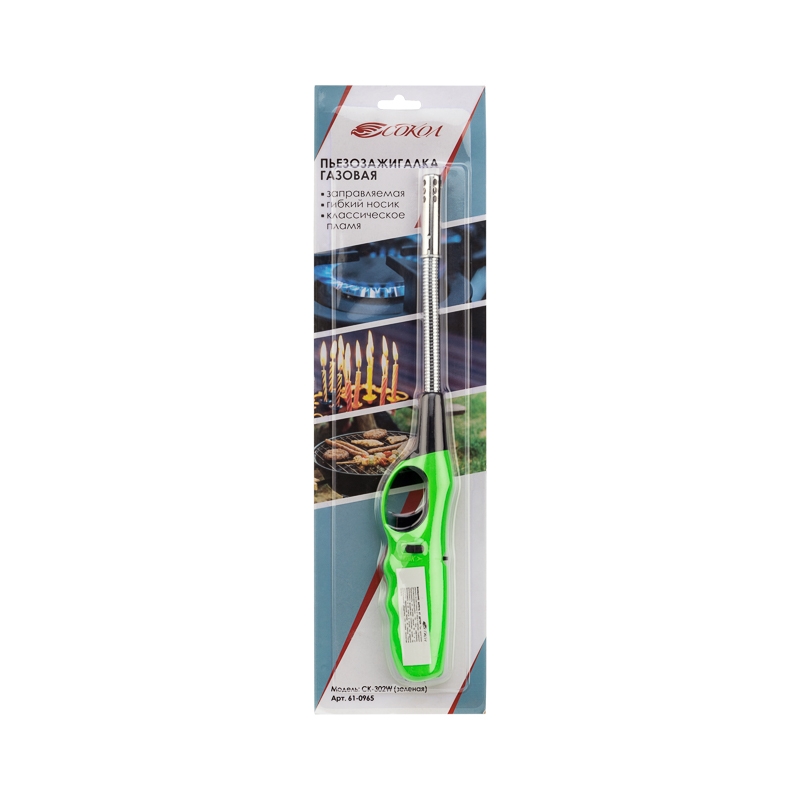 Бытовая газовая пьезозажигалка с классическим пламенем многоразовая (1 шт.) зеленая СК-302W с гибким стержнем СОКОЛ