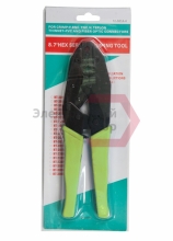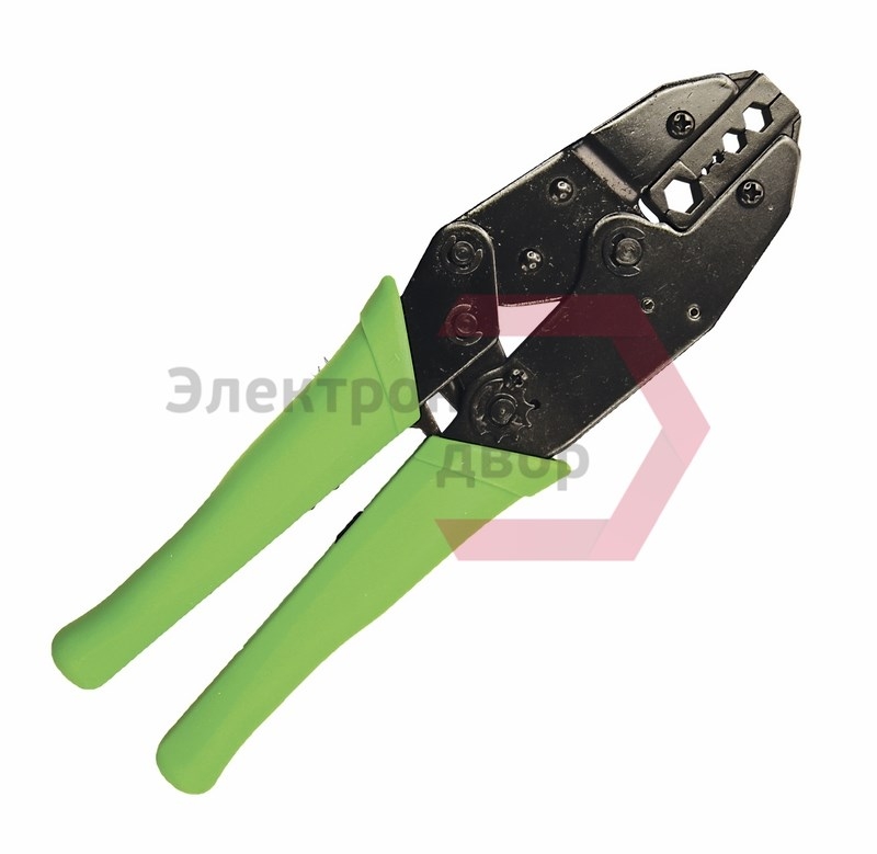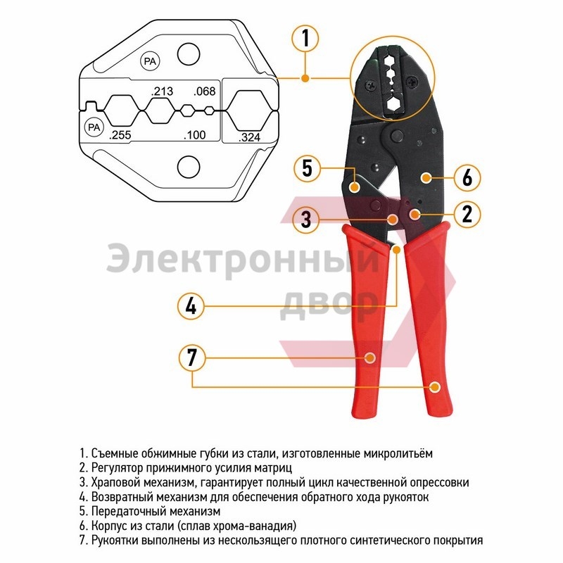 Корпус обработан воронением и изготовлен из закаленной инструментальной стали, с регулятором силы сжатия. Храповой механизм гарантирует полный цикл качественной опрессовки. Обжимные губки съемные из стального микролитья. Клещи оборудованы возвратным механизмом для обеспечения обратного хода рукояток и специальным передаточным механизмом, который уменьшает нагрузку на руку при сжатии, облегчая длительную работу инструментом.