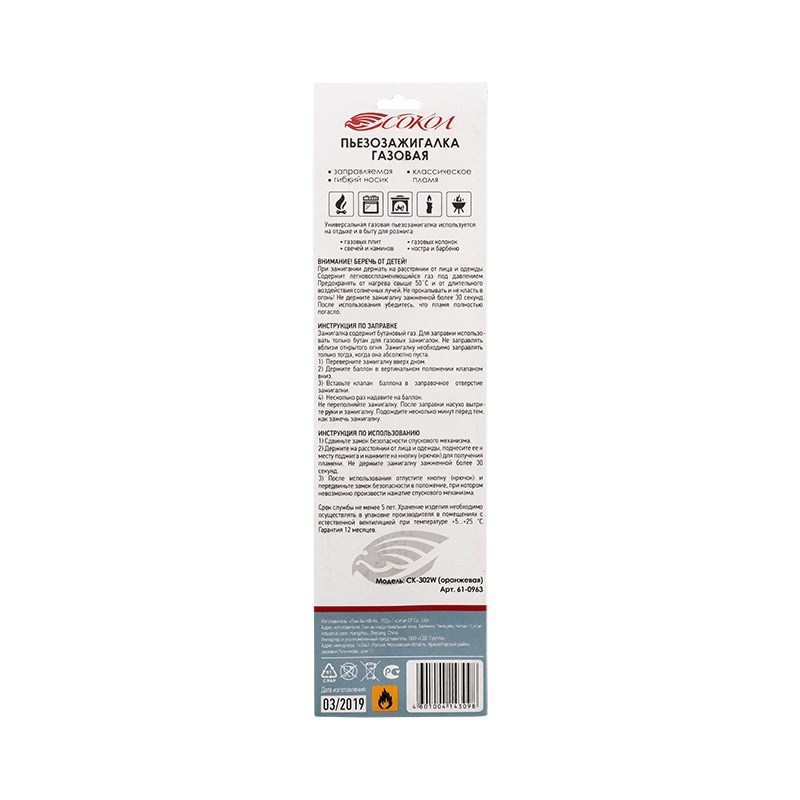 Пьезозажигалка газовая многоразовая, оранж СК-302W СОКОЛ