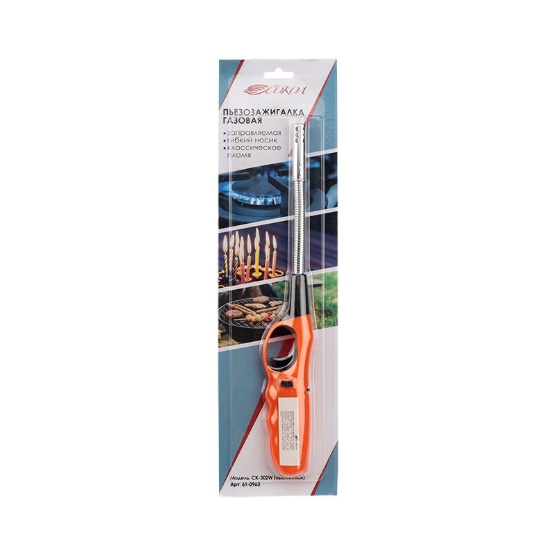 Зажигалка газовая бытовая, с пьезоэлементом и гибким стержнем. Общие габариты зажигалки: 258х33х21 мм Основные характеристики: Регулировка пламени Возможность наполнения Детский предохранитель Цвет: оранжевый