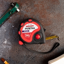 Длина: 3 метра Ширина полотна: 16 мм Эргономичный дизайн Прорезиненный корпус Полотно из закаленной стали Большой вылет полотна без излома Ударопрочный ABC пластик Надежный сдвижной фиксатор Глянцевое покрытие полотна