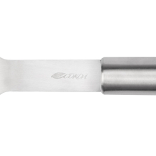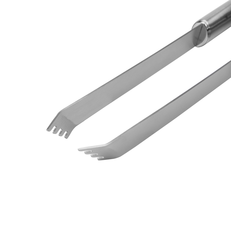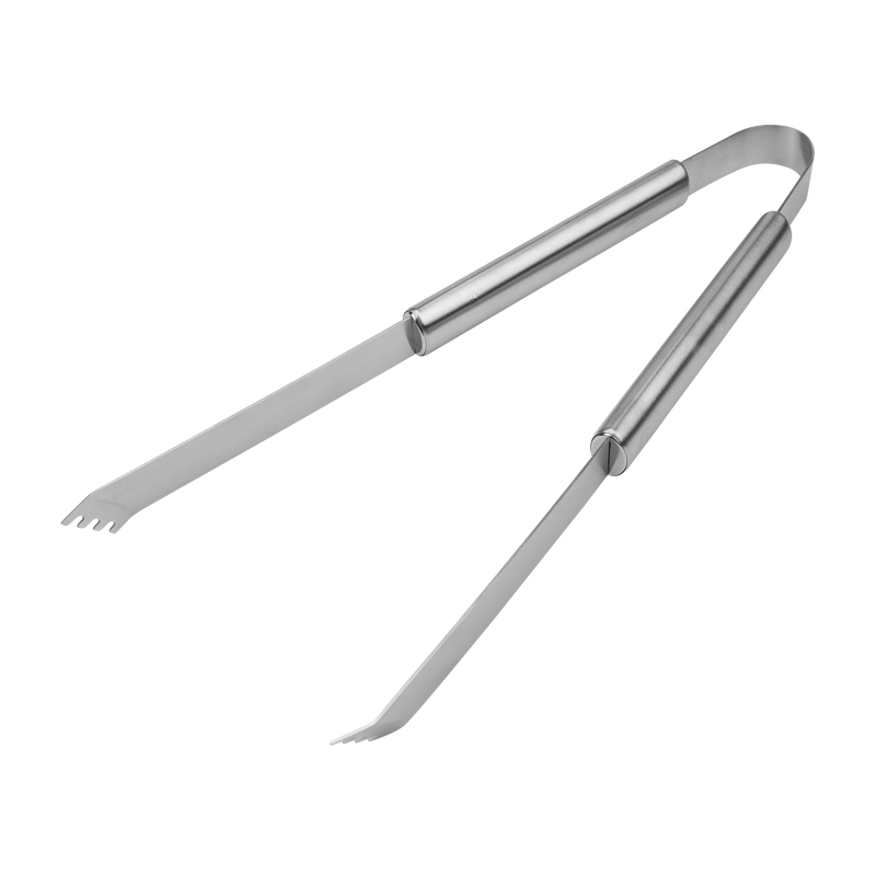 Для удобства захвата продуктов питания края щипцов имеют волнообразную форму. Размер изделия: 440х70х1,5 мм. Толщина ручки: 32 мм.