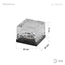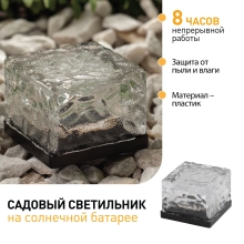 Уличный садовый светильник ERASF024-20 "Ледяной куб" предназначен для подсветки растений в саду, декоративного прудика, аллеи или входа в дом. Особенно эффектно подсветка смотрится в ступеньках или парковых дорожках. Модель имеет габариты 8х8х7 см и с легкостью устанавливается в землю. Комплект состоит из одного кубика. Садовый светильник работает на солнечной батарее. Такой тип получения энергии является самым экологичным, энергоемким, а также бесшумным. Питание происходит во включенном режиме, днем.