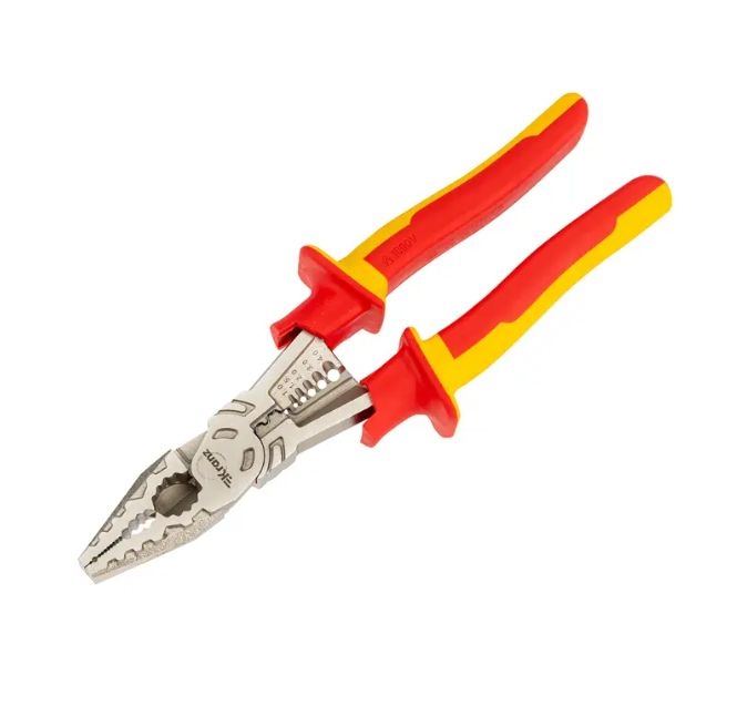 Многофункциональные диэлектрические плоскогубцы – это идеальный инструмент на все случаи жизни, включающий в себя: плоскогубцы, бокорезы, инструмент для зачистки кабеля, инструмент для обжима клемм. Плоскогубцы обладают отличной режущей способностью, используются для удаления изоляции и обжима проводов, для резки/зачистки пластика, медных и мягких проводов, а также для обжима изолированных и неизолированных наконечников. Инструмент подходит для обжима кабеля от 1 до 6 мм² и для зачистки кабеля от 1 до 4 мм². Применяется для работы с оборудованием напряжением до 1000 В – защищает мастера от поражения электрическим током. Высокое качество металла позволит сохранить инструмент в отличном состоянии на долгие годы.