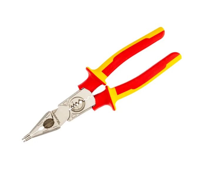 Многофункциональные диэлектрические плоскогубцы – это инструмент на все случаи жизни, включающий в себя: плоскогубцы, бокорезы, инструмент для зачистки кабеля, инструмент для обжима клемм. Плоскогубцы изготовлены из профессиональной хромованадиевой стали (60Cr-V), максимальная твердость – 62HRC. Имеют специальные наконечники для работы со стопорными кольцами. Инструмент подходит для обжима кабеля от 1 до 6 мм² и для зачистки кабеля от 1,5 мм² до 4 мм². Используется для работы с оборудованием напряжением до 1000 В – защищает мастера от поражения электрическим током. Плоскогубцы обладают отличной режущей способностью, подходят для резки/зачистки пластика, медных и мягких проводов, а также для обжима изолированных и неизолированных наконечников. Высокое качество металла позволит сохранить инструмент в отличном состоянии на долгие годы.