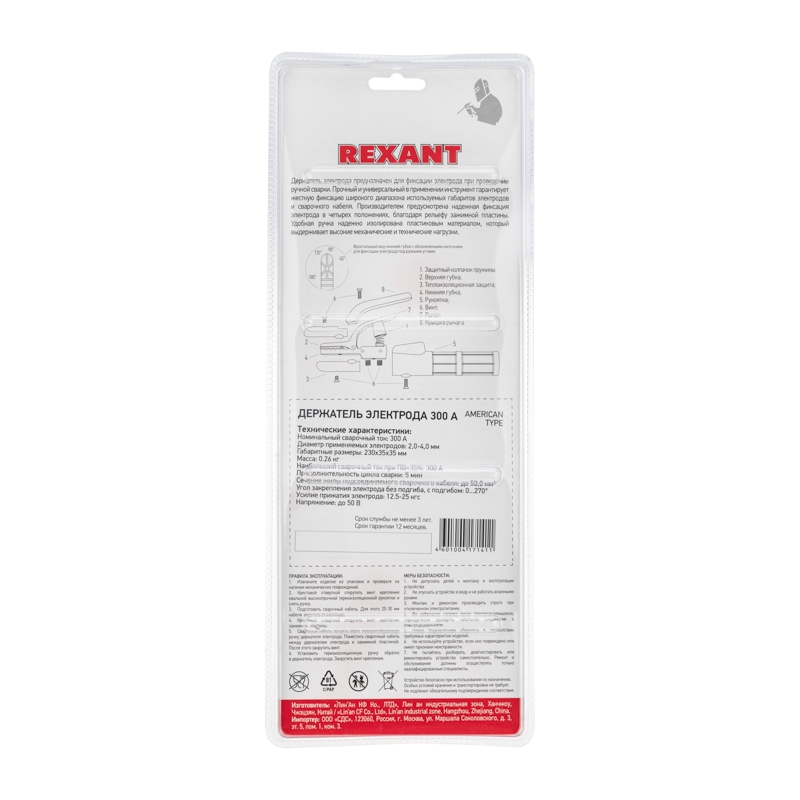 Держатель электрода REXANT 300 А предназначен для фиксации электрода при проведении ручной сварки.