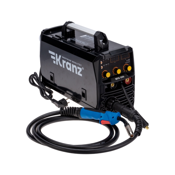 Сварочный аппарат инверторный полуавтоматический MIG-200 KRANZ представляет собой компактный, надежный и удобный прибор для сварки MIG/MAG/MMA. Подходит для бытового и полупрофессионального применения: выполнения работ на строительных объектах, в гараже, в мастерской, на даче и в загородном доме. Аппарат работает от сети 220 В. Данная модель имеет компактный корпус и полный комплект для производства сварочных работ.Аппарат поддерживает обратную и прямую полярность при сварке и работает с электродами 2-5 мм. Обладает такими преимуществами как плавная регулировка сварочного тока, легкий старт (поджиг дуги) и отсутствие брызг при сварке.Предусмотрены такие функции, как поджиг повышенным током (антиприлипание), форсаж дуги в режиме ММА, HotStart в режиме ММА, дожигание сварочной проволоки, защита от перепадов напряжения, возможность работы с порошковой проволокой.Характеристики:Напряжение питающей сети:220 +- 15%Частота питающей сети: 50-60 ГцПотребляемая мощность: 6,9 кВтМаксимальный потребляемый ток: 30 АНоминальный ток потребления: 25 АСварочный ток MMA: 30-200 АСварочный ток MIG/MAG: 40-200 АРабочее напряжение ММА: 21,2-28Рабочее напряжение MIG/MAG: 15,5-24Напряжение холостого хода: 76 ВПотребление без нагрузки: 25 ВтРабочий цикл: 70%Коэффициент мощности: 0,73КПД: 85%Класс изоляции: FКласс защиты: IP 21SМасса, кг: 10,76Рабочий диапазон температуры окружающей среды: -20  +50Диаметр сварочной проволоки: 0,8-1,0 ммКомплектация:Инверторный сварочный аппарат MIG/MAG - 1 шт.Кабель длиной 1,8 метра с электрододержателем - 1 шт.Кабель длиной 1,2 метра с зажимом массы - 1 шт.Сварочная горелка: 3 м, съёмнаяЗащитный щиток - 1 шт.Молоток - 1 шт.Инструкция по эксплуатации -1 шт.