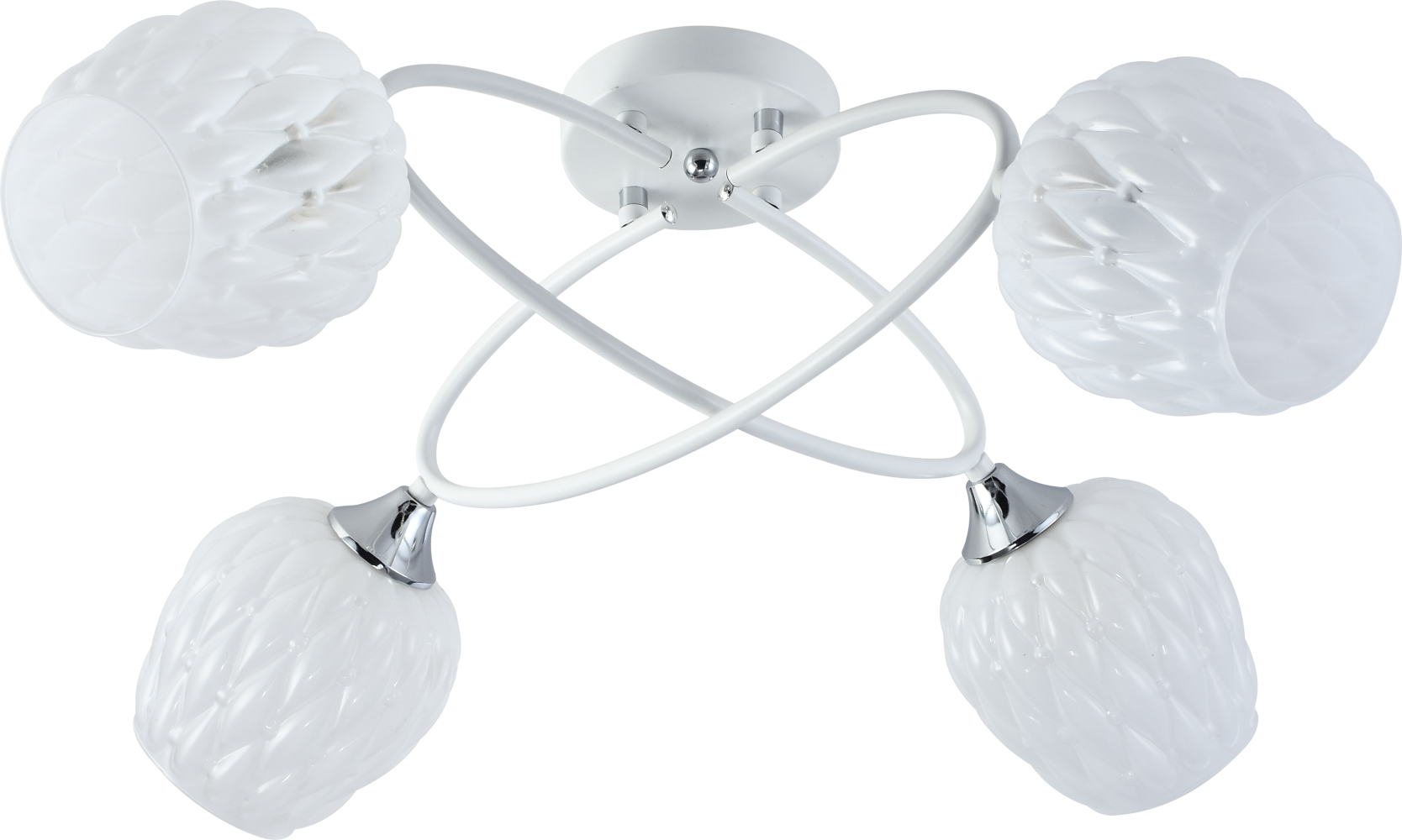 Rivoli Hettie (арт. 3136-304) - люстры итальянского дизайна, отличающиеся оригинальной металлической арматурой и фигурными плафонами из белого матового стекла. Овальные перекрестные держатели плафонов окрашены в базовый белый цвет, универсальный для любых интерьеров. Люстры потолочные Hettie Rivoli выполнены в стиле модерн. Стеклянные плафоны в классической форме бутонов имеют объемный рисунок с ромбами.    Люстры Hettie освещают 12 м2. Эти стильные светлые люстры с 4 белыми матовыми плафонами хороши для кухни, коридора, прихожей, небольшой спальни или детской комнаты. Дизайнерские люстры на кухню Rivoli Hettie устойчивы к выцветанию и образованию царапин, сколов благодаря гальваническому покрытию корпуса. Четыре плафона с закаленным стеклом также обеспечивают долгий срок службы люстры.    Коллекцию Hettie европейского бренда Rivoli дополняют люстры потолочные под 6 ламп - арт. 3136-306. Рекомендуемые источники света для современной люстры коллекции Hettie - Е27 60 Вт.