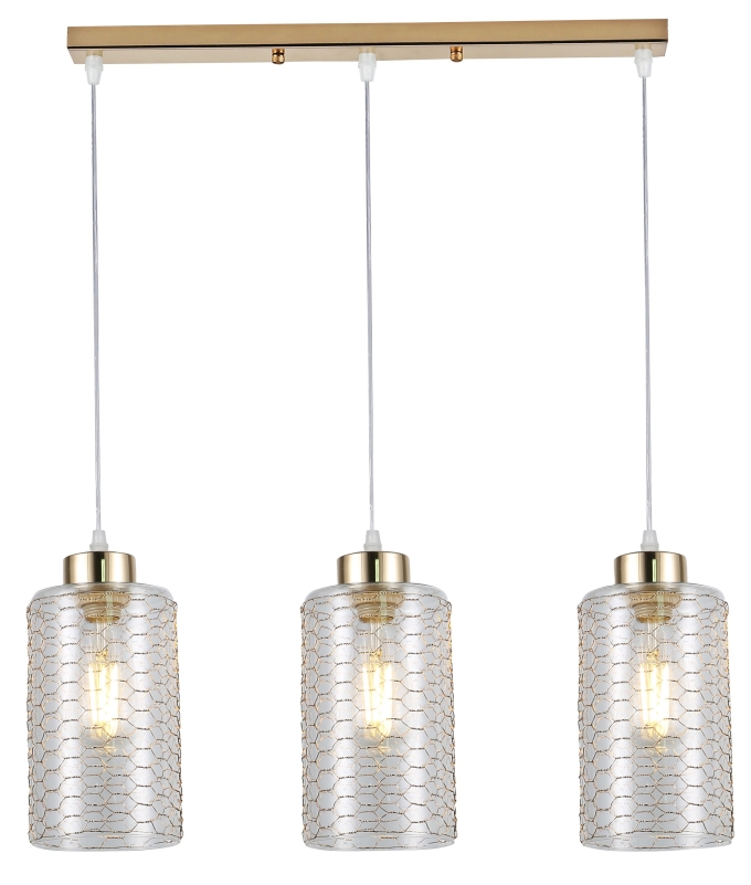 Malice (арт. 9124-203) - подвесной светильник потолочный с 3 прозрачными плафонами-стаканчиками. Плафоны из качественного закаленного стекла декорированы золотой 'паутинкой', формирующей узор пчелиных сот. Подвесные светильники Malice от европейского бренда Rivoli идеальны для кухни, прихожей, гостиной, спальни и часто применяются в профессиональных дизайн-проектах. Стиль этих подвесных светильников на тросах - модерн. Высоту подвеса легко отрегулировать при установке светильника.     Подвесные светильники Malice на удлиненной рейке золотого цвета объединяют сразу 3 стеклянных плафона на прочных прозрачных тросах. Эти подвесные светильники под три лампы Е27 40 Вт освещают 9 м2 и могут применяться как полноценная люстра. Окрашивание металлических элементов произведено гальваническим способом, что обеспечивает стойкость и красоту золотого цвета. Прозрачное стекло и золотистая арматура великолепно сочетаются.     Коллекцию Malice дополняют подвесные светильники над столом под 1 лампу - арт. 9124-201.