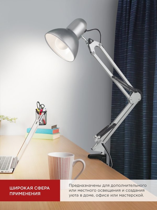 Настольный светильник СНО 15 имеет прочный металлический корпус и устойчивое основание, в комплект также входит струбцина с глубиной захвата до 4 см, позволяющая закрепить светильник на горизонтальной или вертикальной поверхности.