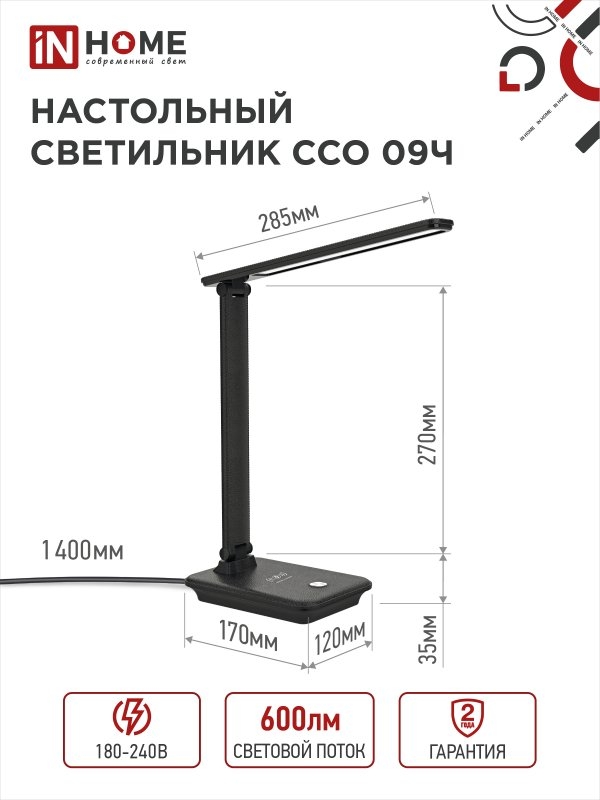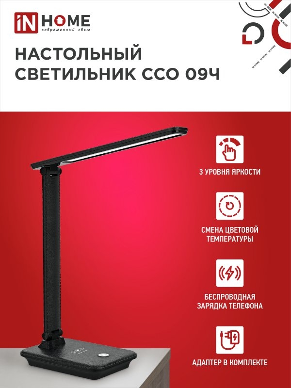 Светильник IN HOME ССО 09Ч 12Вт 3000К-6500К 600Лм сенсор-диммер с бесп.зарядкой ЧЕРНЫЙ