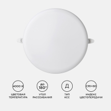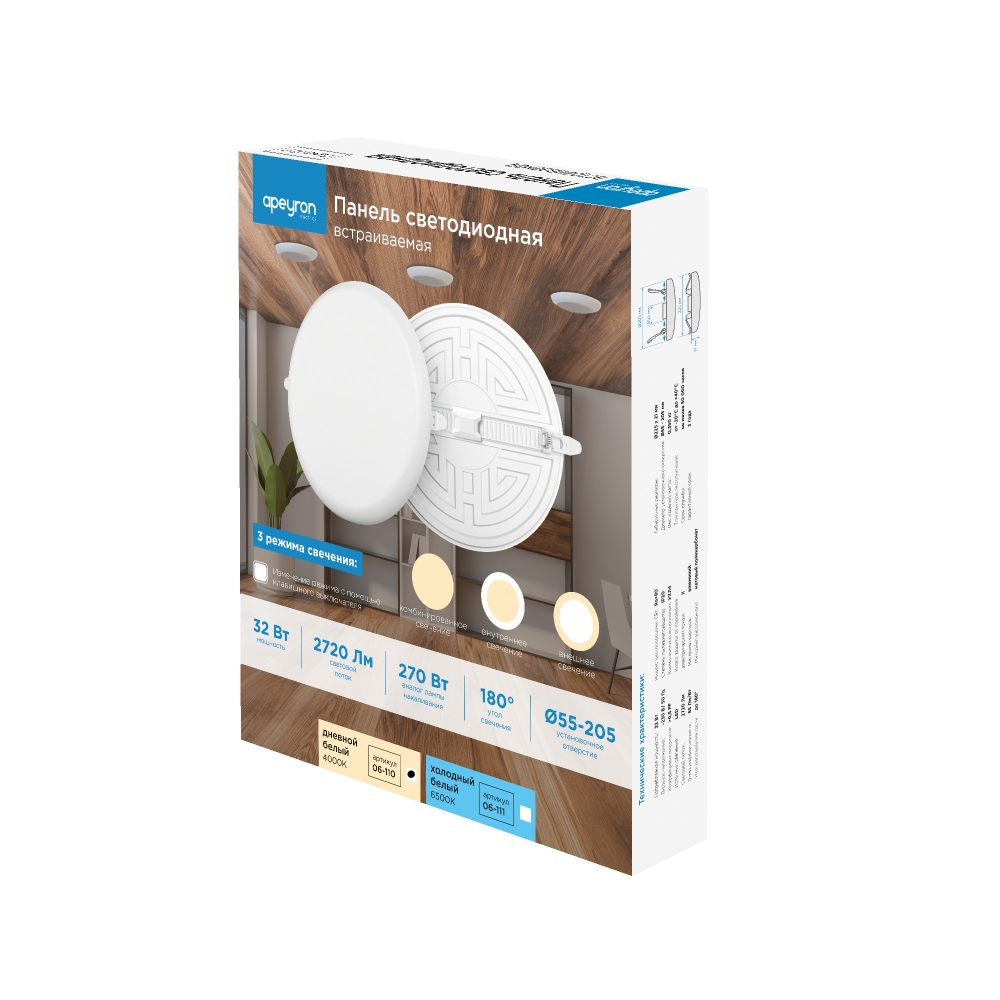 Светодиодная встраиваемая безрамочная панель 06-110 излучает световой поток в 2720 Лм, потребляя при этом 32 Вт (24Вт+8Вт), что в итоге дает энергоэффективность 85 Лм/Вт. Особенностью данного изделия является 3-х ступенчатая регулировка уровня освещенности путем нажатия клавиши выключателя: 1) освещение всей поверхности плафона, угол рассеивания 180°; 2) концентрированное освещение внутреннего диаметра, угол рассеивания 120°; 3) засветка торцевой части панели, эффект «кольцевого освещения». Вторая особенность панели – регулировка крепежных зажимов под посадочное отверстие Ø55-205 мм. Третья особенность – безрамочный дизайн плафона, благодаря чему возможна повышенная освещенность с углом рассеивания 180°. Размер изделия Ø225х21мм. Цветовая температура 4000К наиболее близка к естественному солнечному свету. Отдельный от корпуса драйвер имеет компактный размер. А благодаря удобному коннектору для соединения со светильником может быть легко заменен. Панель по способу монтажа является встраиваемой.