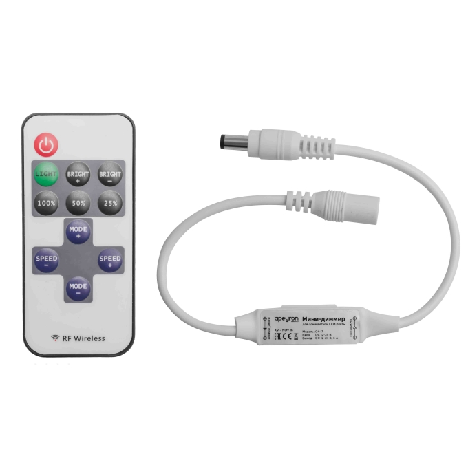 Мини-диммер APEYRON 12/24В, 72/144Вт,RF, пульт кнопочный (без батареек) , для монохромной ленты, 40х12х5мм