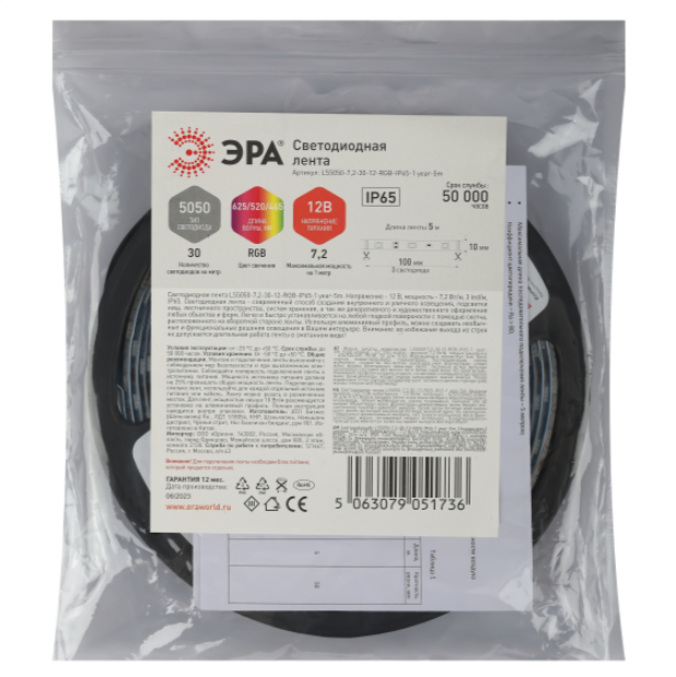 Светодиодная лента LS5050-7,2-30-12-RGB-IP65-1 year-5m со степенью защиты от пыли и влаги IP65 - современный способ создания внутреннего освещения, подсветки ниш, лестничного пространства, систем хранения, а также декоративного и художественного оформления любых объектов и форм в помещениях с повышенным уровнем влажности и уличного освещения. Легко и быстро устанавливается на любой гладкой поверхности с помощью скотча, расположенного на оборотной стороне ленты. Используя алюминиевый профиль, можно создавать необычные и функциональные решения освещения в Вашем интерьере. Рабочее напряжение ленты составляет 12 В, а мощность равна 7,2 Вт/м. Светодиодная лента обладает - цветом свечения RGB(625/520/465нМ).