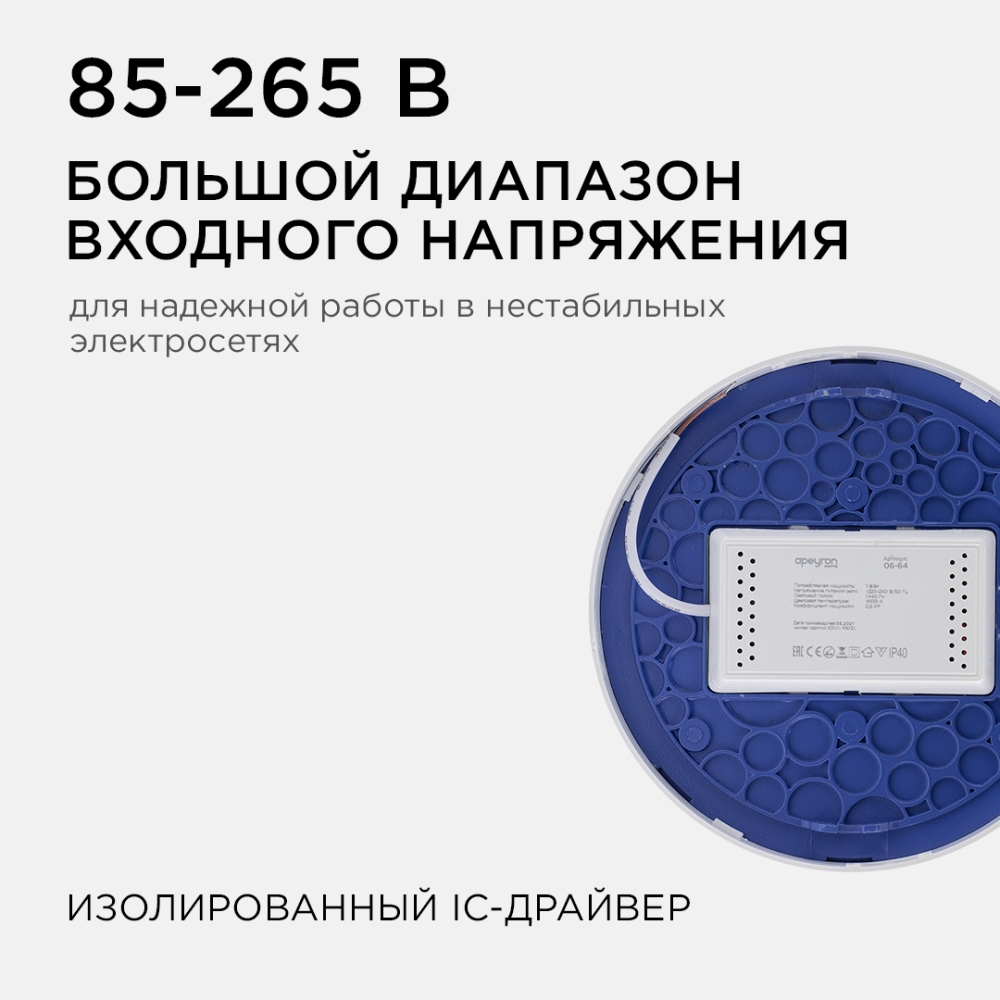 Светодиодная панель 06-64 излучает световой поток в 1440Лм, потребляя при этом 18Вт, что в итоге дает энергоэффективность 80Лм/Вт. Цветовая температура 6500К повышает концентрацию, настраивает на рабочий лад, поэтому мы рекомендуем использование холодного цвета свечения в местах, требующих повышенной работоспособности, внимания и точности. Встроенный драйвер снимет вопрос о том, как его разместить, и облегчит монтаж светильника. Круглая форма корпуса позволит создать дизайн с оттенками вечности, тайны и магии. Накладной тип монтажа позволит смонтировать эту панель на любую плоскость, а наличие в комплекте всех необходимых для этого деталей подарит возможность не задумываться в последний момент, где их взять.