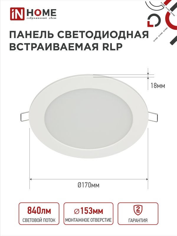 Светильник встраиваемый LED IN HOME RLP 12Вт 6500К 840Лм Ø170/153/18мм IP40 круг