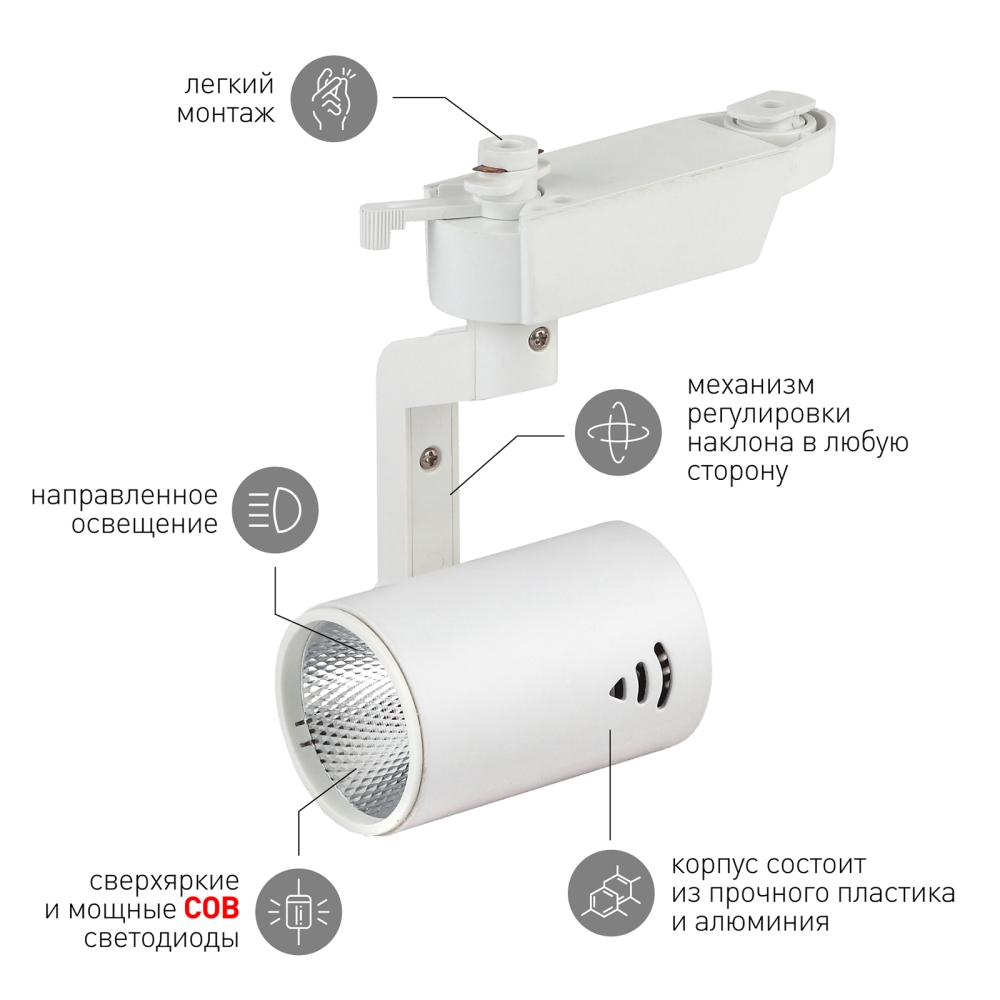 Трековый светодиодный светильник, предназначенный для монтажа на шинопроводе. Цветовая температура светильника составляет 4000 К, срок службы 30000 часов. Трековый светильник прекрасно подойдет для создания зонированного пространства в помещении офиса, магазина или конференц-зала. Направленный свет позволит выделить требуемую зону, привлечь внимание к конкретным предметам. Светодиодные лампы легко монтируются, не требуют дополнительного ухода, вписываются практически в любой дизайн, подчеркивая его достоинства.